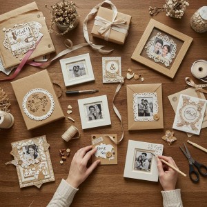 次に、「半完成品を活用する」テクニック。無印良品やロフトで販売されている白いフォトフレームに、二人の思い出の写真とドライフラワーを添えるだけでオリジナリティ溢れるギフトになります。