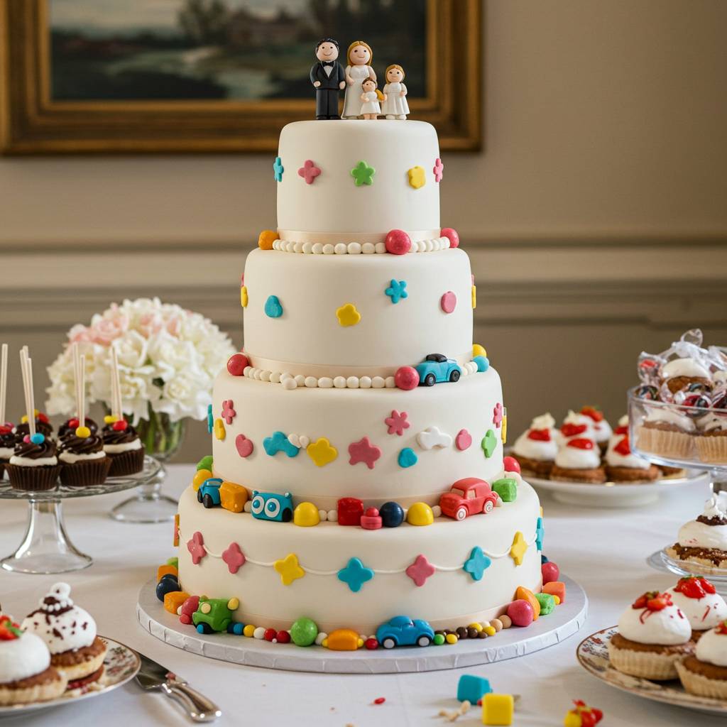 子連れ婚やファミリーウェディングでは、ウェディングケーキが大きな役割を果たします。以下は、見た目も楽しめて子どもが夢中になる人気のケーキアイデアです。