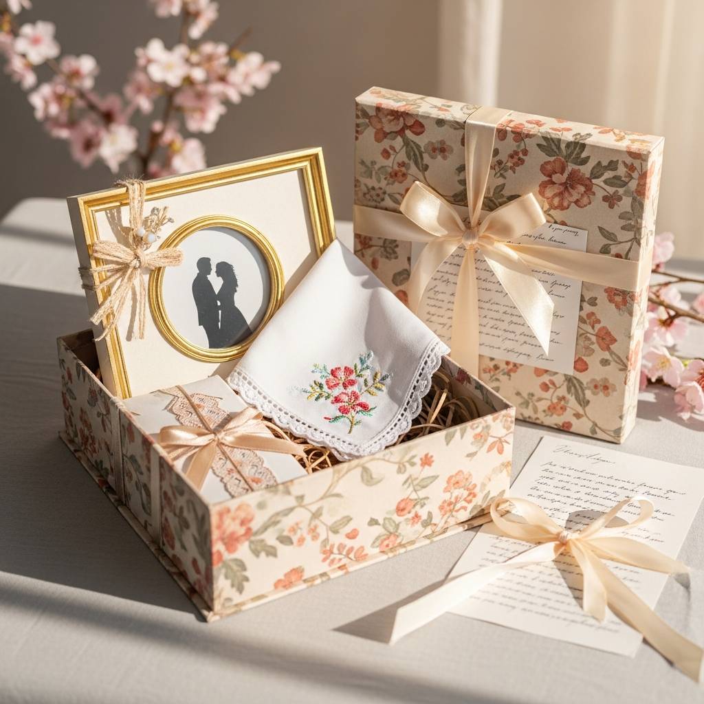 新郎新婦のイニシャルや結婚式の日付を刺繍したハンカチは、小さくても思いの詰まった贈り物になります。熟練の技術がなくても、シンプルなモチーフから挑戦できます。上質なリネンやコットンを使用すれば、日常使いしながらも特別な記念品として大切にされるでしょう。