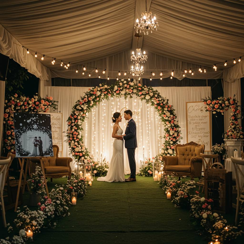 - 天井装飾:バルーンや吊り花、シルク布で立体感と空間の一体感を演出。ゲストが見上げる構図も写真映え。